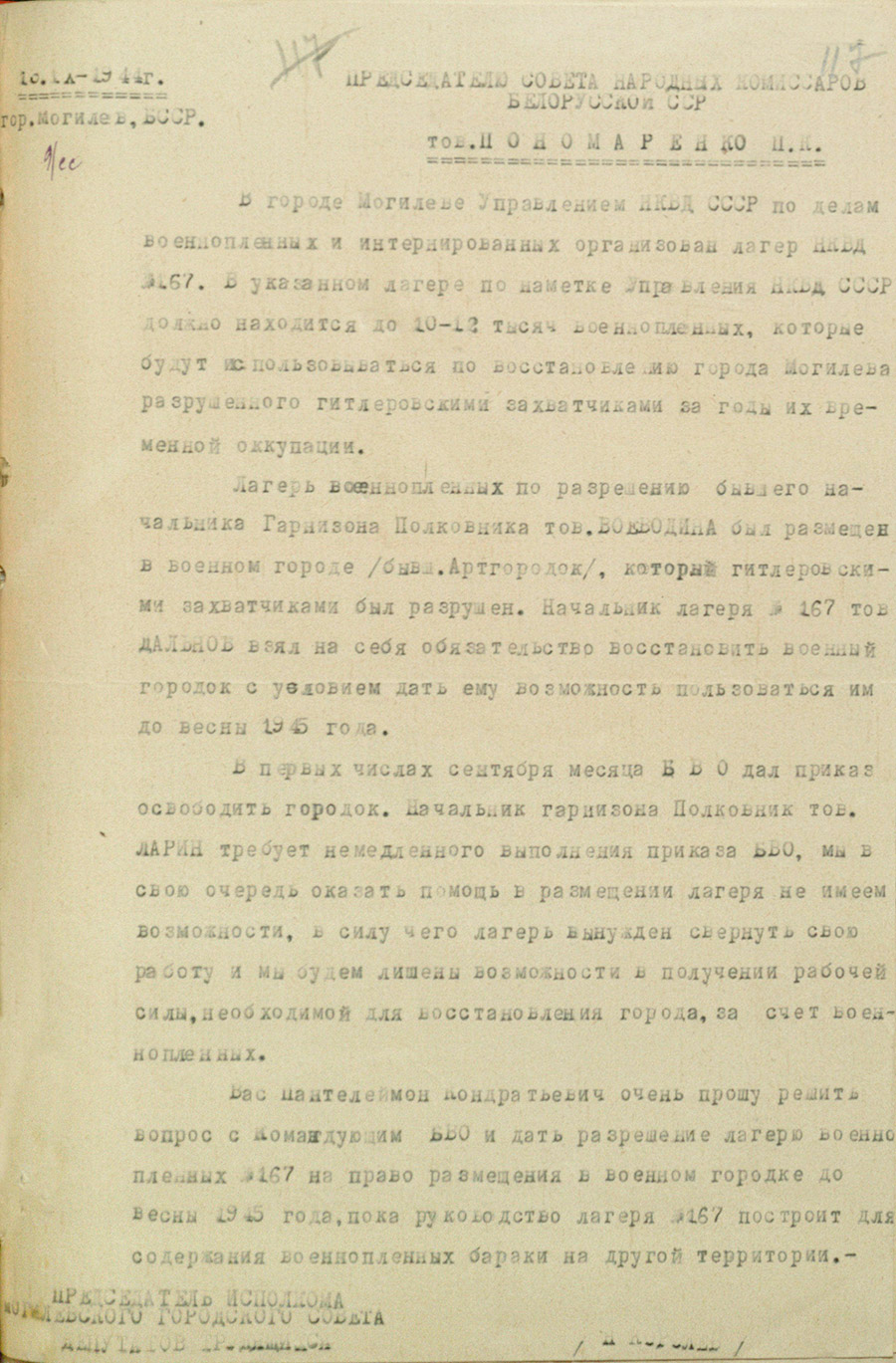 | 7. Письмо председателя исполнительного комитета Могилевского городского Совета депутатов трудящихся Н.Ф. Королева к председателю СНК БССР П.К.Пономаренко о размещении лагеря военнопленных №3167 (Ф. 11 Оп. 3 Д. 1 Л. 117). |