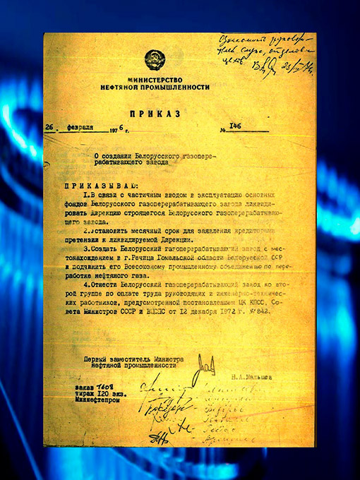 Зональный государственный архив в г.Речице представляет документ о создании Белорусского газоперерабатывающего завода