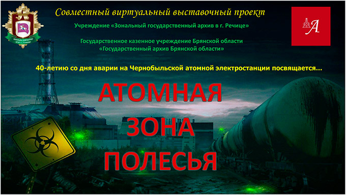 В рамках международного сотрудничества учреждение «Зональный государственный архив в г.Речице» и государственное казенное учреждение Брянской области «Государственный архив Брянской области» подготовили совместную виртуальную выставку архивных документов «Атомная зона Полесья», приуроченную к 40-й годовщине аварии на Чернобыльской АЭС (26 апреля 1986 года).