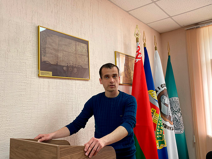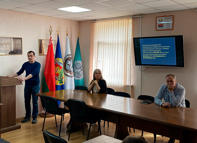 Перед коллегами выступил молодой работник заведующий сектором биографических запросов, председатель первичной ячейки БРСМ Евгений Завадский. В своем докладе и тематической презентации он представил детальную хронологию событий сорокалетней давности, рассказал о мужестве ликвидаторов и осветил современные достижения страны в обеспечении радиационной безопасности и экологическом мониторинге.