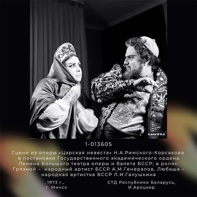 Сцена из оперы «Царская невеста» Н.А.Римского-Корсакова в постановке Государственного академического ордена Ленина Большого театра оперы и балета БССР; в ролях: Грязной – народный артист БССР А.М.Генералов, Любаша – народная артистка БССР Л.И.Галушкина