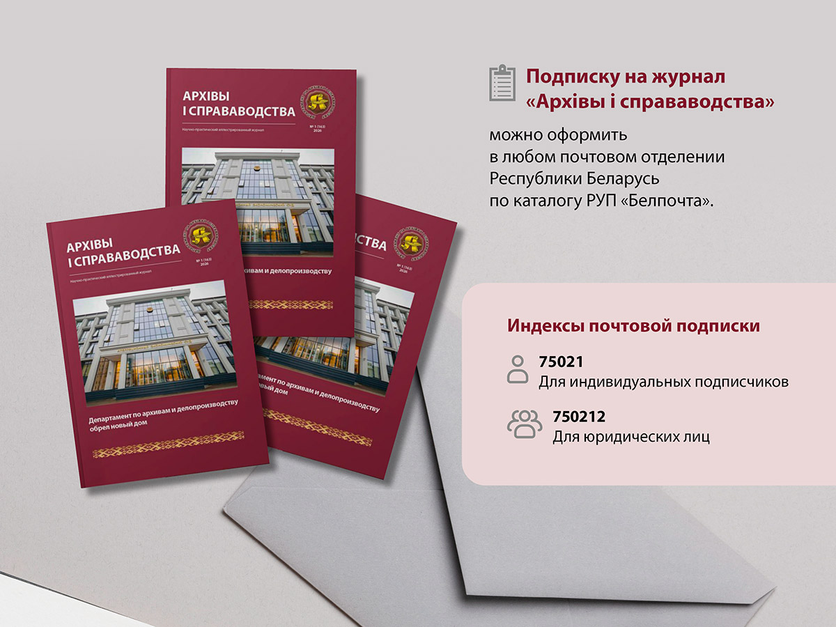 В соответствии с приказом Министра юстиции Республики Беларусь от 11 ноября 2025 г. №171 «О реорганизации» 05.01.2026 проведена реорганизация Учреждения «Редакция журнала «Юстиция Беларуси» путем присоединения к нему Учреждения «Редакция журнала «Архивы и делопроизводство». Права и обязанности учредителя средства массовой информации журнала «Архівы і справаводства» Департаментом по архивам и делопроизводству Министерства юстиции Республики Беларусь переданы Министерству юстиции Республики Беларусь.